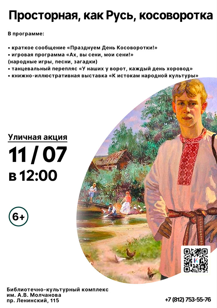 11 июля в 12.00 на Уличной площадке Библиотечно-культурного комплекса им. А. В. Молчанова (Ленинский пр., д. 115) состоится Уличная акция "Просторная, как Русь, косоворотка".