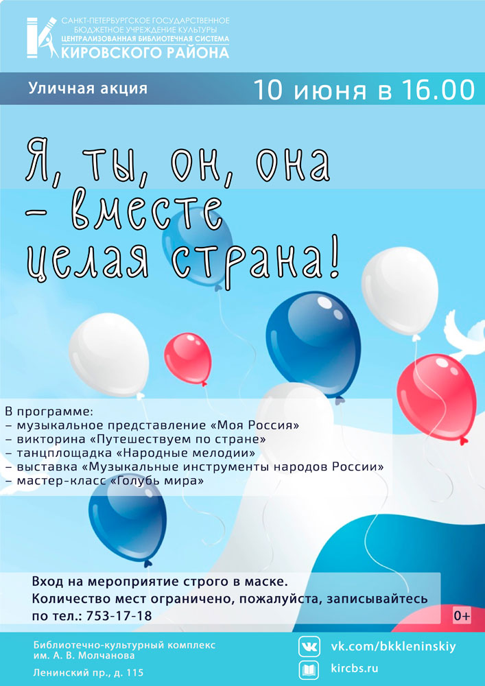 10 июня в 16.00 на уличной площадке Библиотечно-культурного комплекса им. А. В. Молчанова будет проходить Уличная акция "Я, ты, он, она - вместе целая страна!"