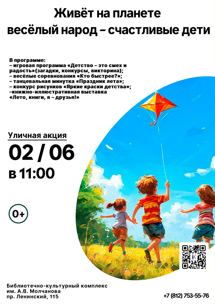 2 июня в 11.00 на уличной площадке Библиотечно-культурного комплекса им. А. В. Молчанова (Ленинский пр., д. 115) состоится Уличная акция "Живёт на планете весёлый народ - счастливые дети".