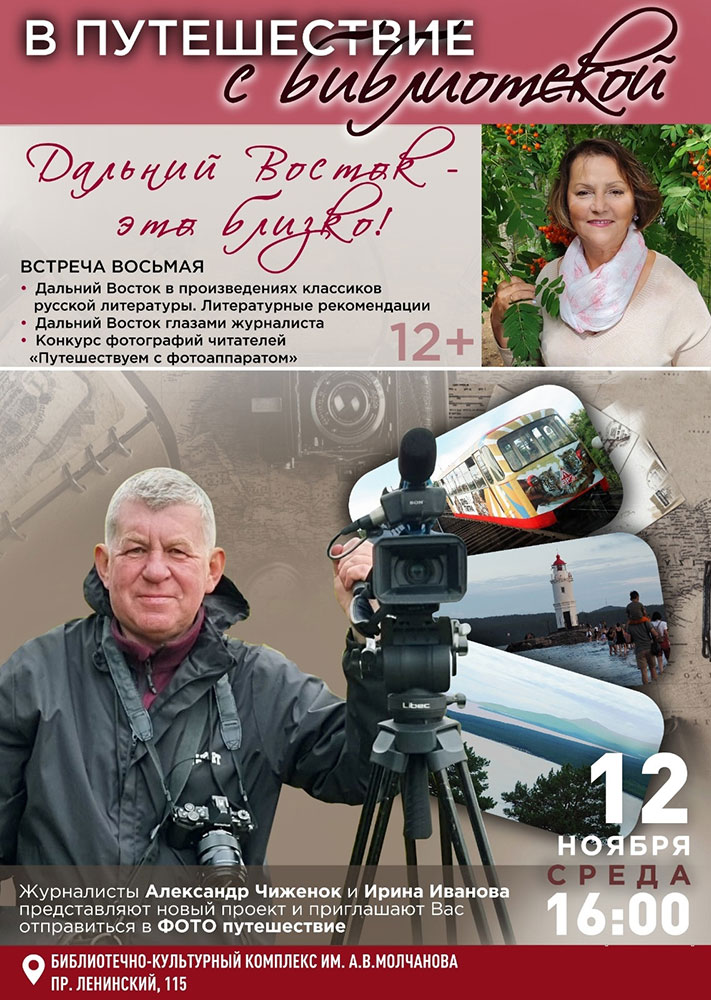 12 ноября в 16.00 в Литературной гостиной Библиотечно-культурного комплекса им. А. Молчанова (Ленинский пр., д. 115) состоится восьмая встреча проекта "В путешествие с библиотекой!". Тема встречи "Дальний Восток - это близко!".