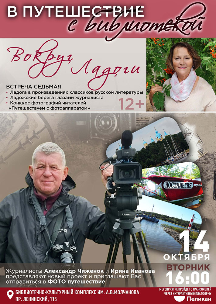14 октября в 16.00 в Концертном зале Библиотечно-культурного комплекса им. А. В. Молчанова (Ленинский пр., д. 115) состоится седьмая встреча проекта "В путешествие с библиотекой!". Тема встречи "Вокруг Ладоги".