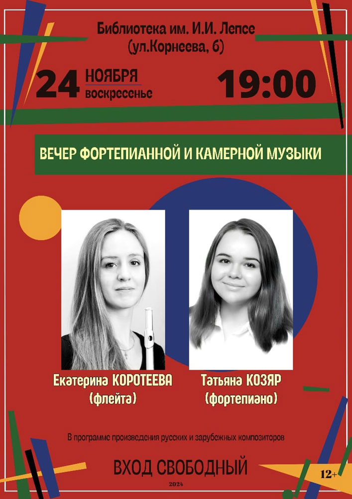 Прозвучат произведения русских и зарубежных композиторов в исполнении Екатерины Коротеевой (флейта) и Татьяны Козяр (фортепиано).