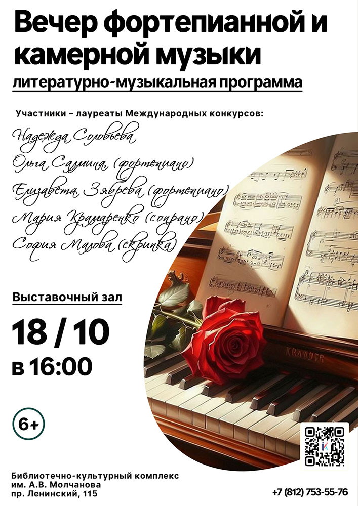 18 октября в 16.00 в Выставочном зале Библиотечно-культурного комплекса им. А. В. Молчанова (Ленинский пр., д. 115) состоится Литературно-музыкальная программа "Вечер фортепианной и камерной музыки".