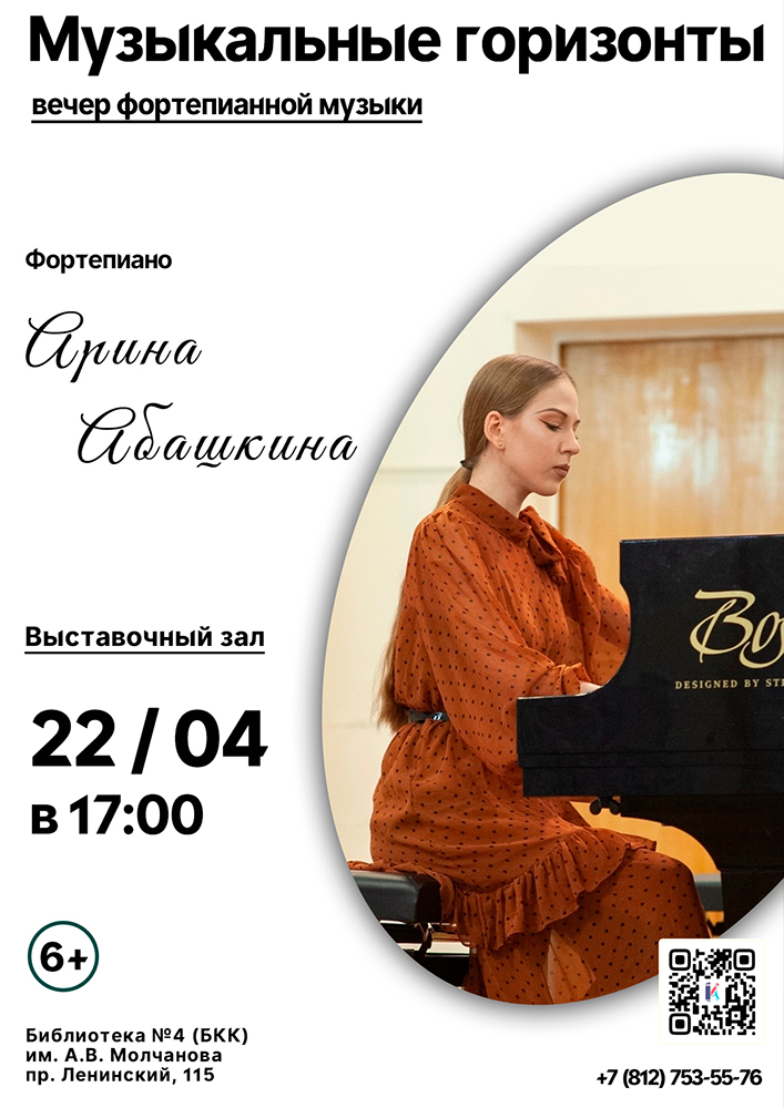22 апреля в 17.00 в выставочном зале Библиотеки №4 (Библиотечно-культурного комплекса) им. А. В. Молчанова (Ленинский пр., д. 115) состоится Вечер фортепианной музыки "Музыкальные горизонты".