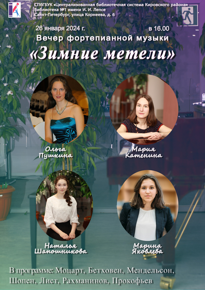 Библиотека №1 им. И. И. Лепсе приглашает всех желающих на Вечер фортепианной музыки "Зимние метели".
