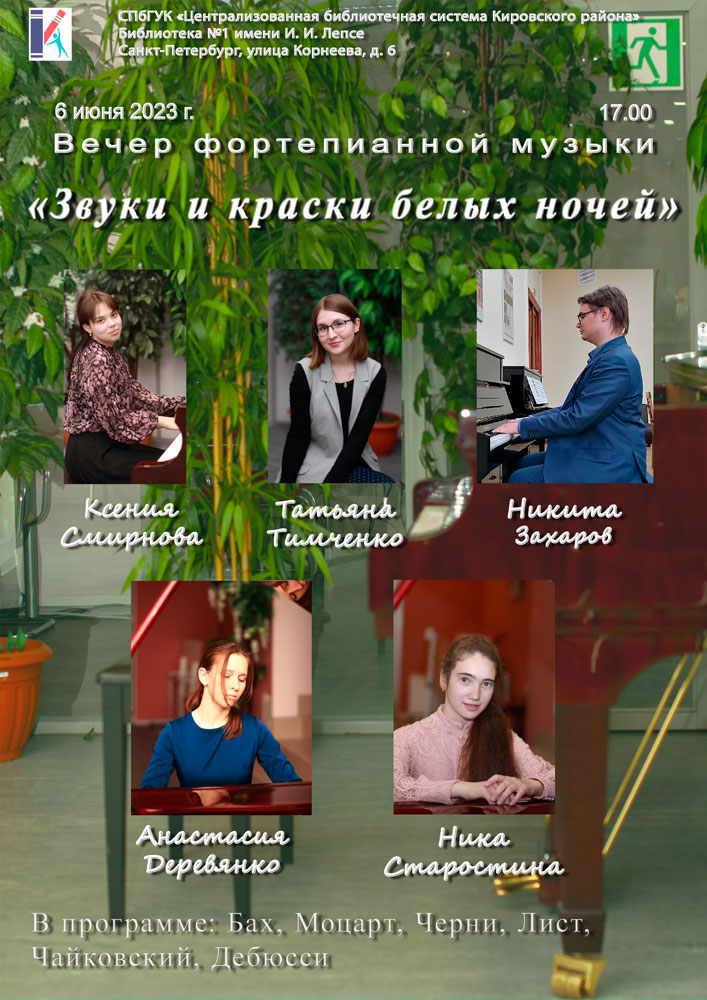 Библиотека №1 им. И. И. Лепсе приглашает на Концерт "Звуки и краски белых ночей" в исполнении студентов Санкт-Петербургского музыкального училища им. М. П. Мусоргского.
