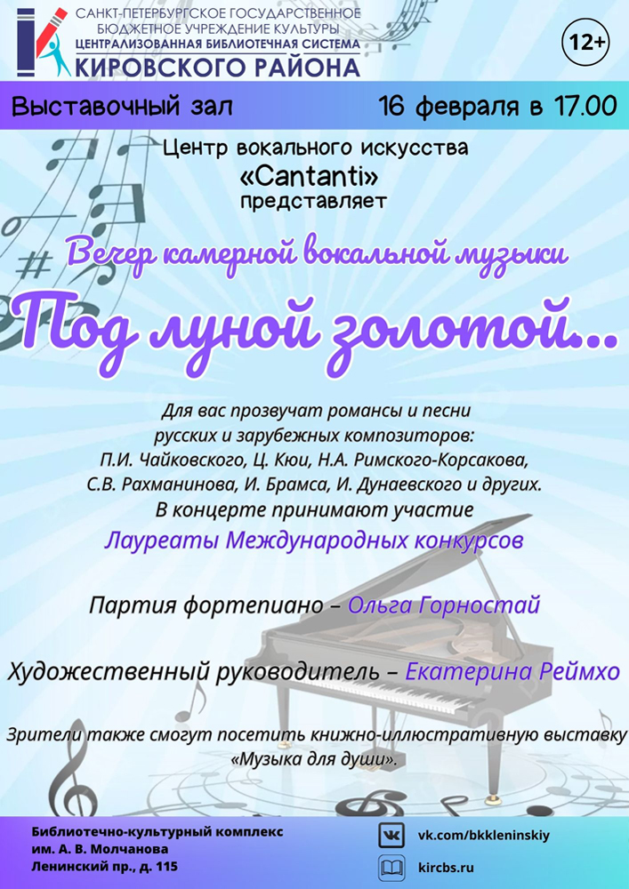 16 февраля в 17.00 в выставочном зале Библиотечно-культурного комплекса им. А. В. Молчанова (Ленинский пр., д. 115) состоится Вечер камерной вокальной музыки "Под луной золотой..."
