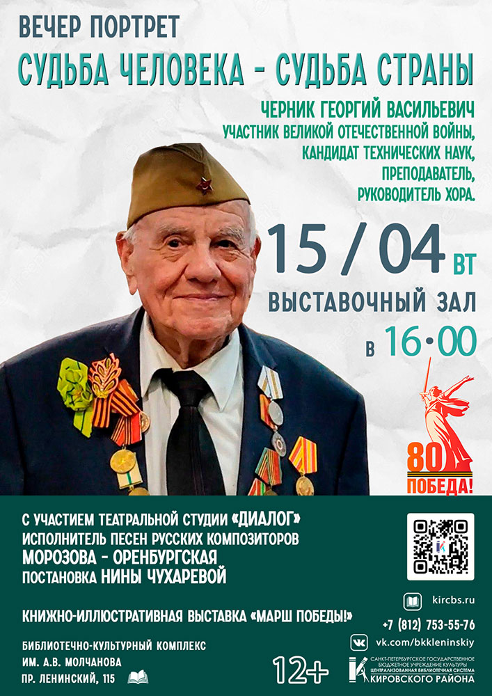 15 апреля в 16.00 в Выставочном зале Библиотечно-культурного комплекса им. А. В. Молчанова (Ленинский пр., д. 115) состоится Вечер портрет "Судьба человека - судьба страны".