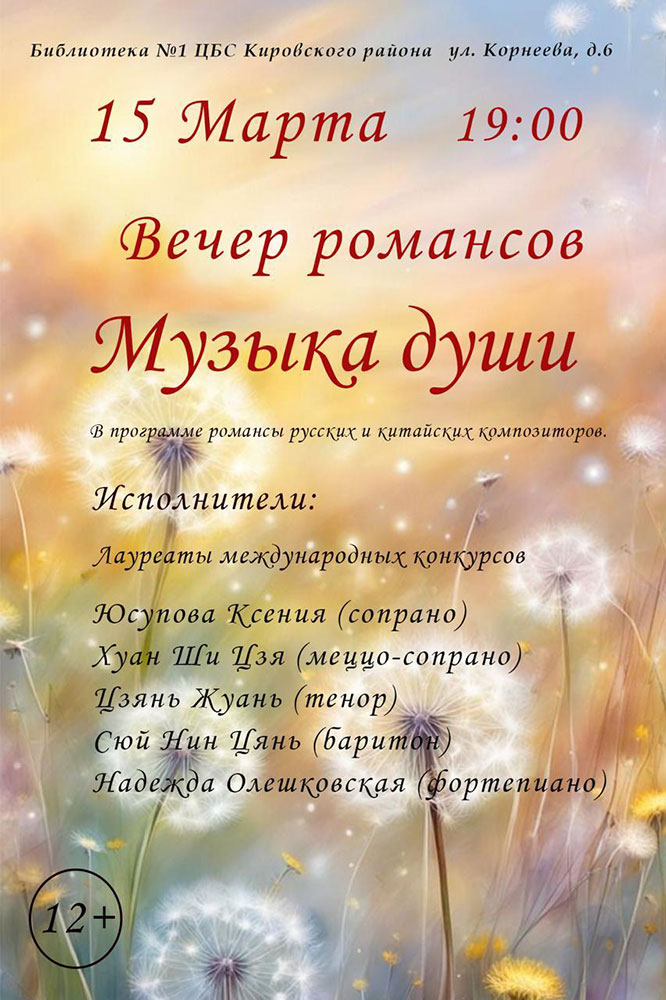 Библиотека №1 им. И. И. Лепсе приглашает на Вечер романсов "Музыка души". В программе романсы русских и китайских композиторов.