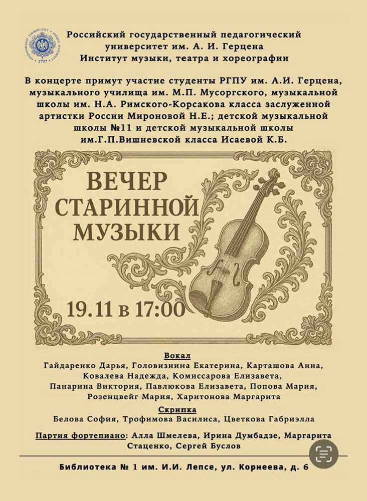 В Библиотеке №1 имени И. И. Лепсе пройдет "Вечер старинной музыки".