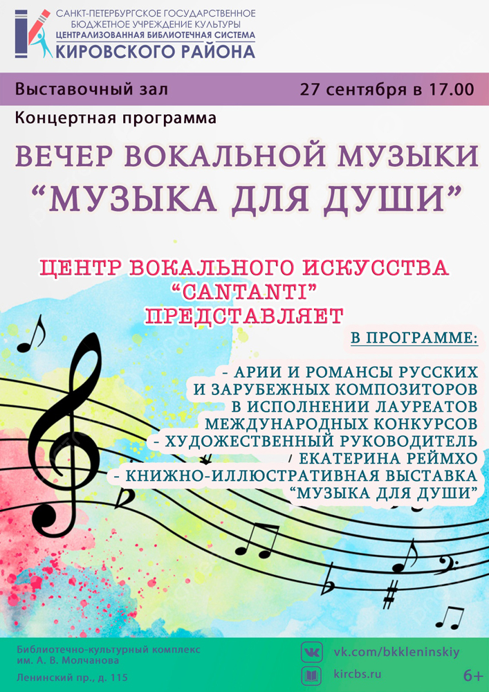 27 сентября в 17.00 в Выставочном зале Библиотечно-культурного комплекса им. А. В. Молчанова (Ленинский пр., д. 115) состоится Вечер вокальной музыки "Музыка для души".