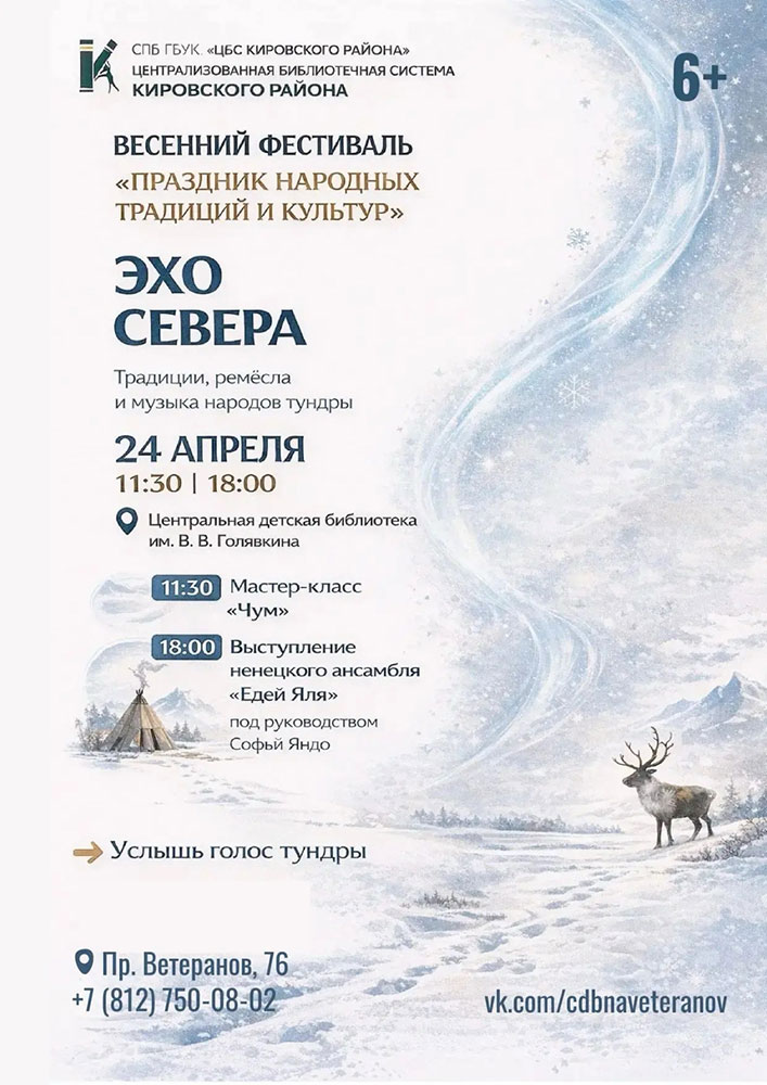 24 апреля - заключительный день Весеннего фестиваля - "Эхо Севера", посвященный Культуре народов Тундры и их традиционному образу жизни. Гости смогут познакомиться с бытом, ремёслами и особенностями северных народов.