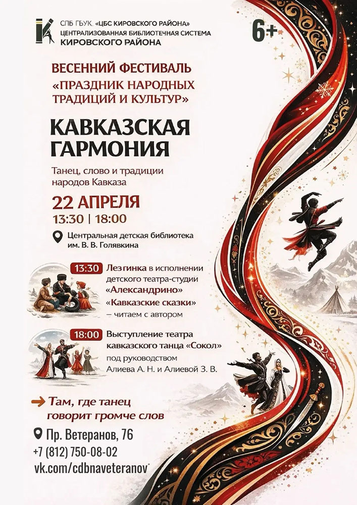 22 апреля в Центральной детской библиотеке им. В. В. Голявкина состоится программа "Кавказская гармония", посвященная культуре народов Кавказа, их традициям, танцам и устному народному творчеству. Этот день наполнен яркими эмоциями, ритмом и живым исполнением.
