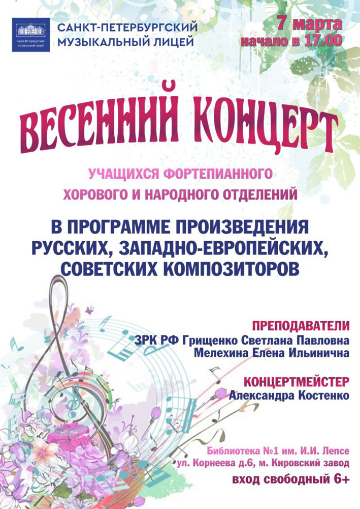 Библиотека №1 им. И. И. Лепсе приглашает на "Весенний концерт" учащихся фортепианного хорового и народного отделений Санкт-Петербургского Музыкального лицея.