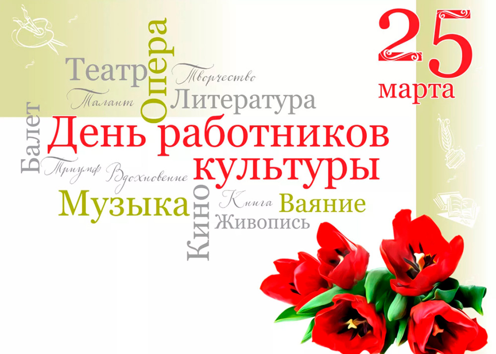 День работников культуры - профессиональный праздник деятелей культуры и искусства. К ним относятся сотрудники музеев, библиотек, зоопарков, театров, музыкальных и танцевальных коллективов, концертных организаций, цирков, культурно-досуговых организаций, домов народного творчества, дворцов культуры, парков культуры и отдыха, организаций кинематографии.