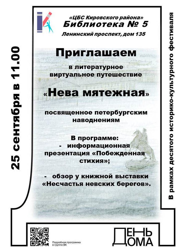 В Библиотеке №5 (Ленинский пр., д. 135), в рамках Х историко-культурного фестиваля "День Дома - 2024", состоится Виртуальное путешествие "Нева мятежная", посвященное наводнениям в истории Петербурга.