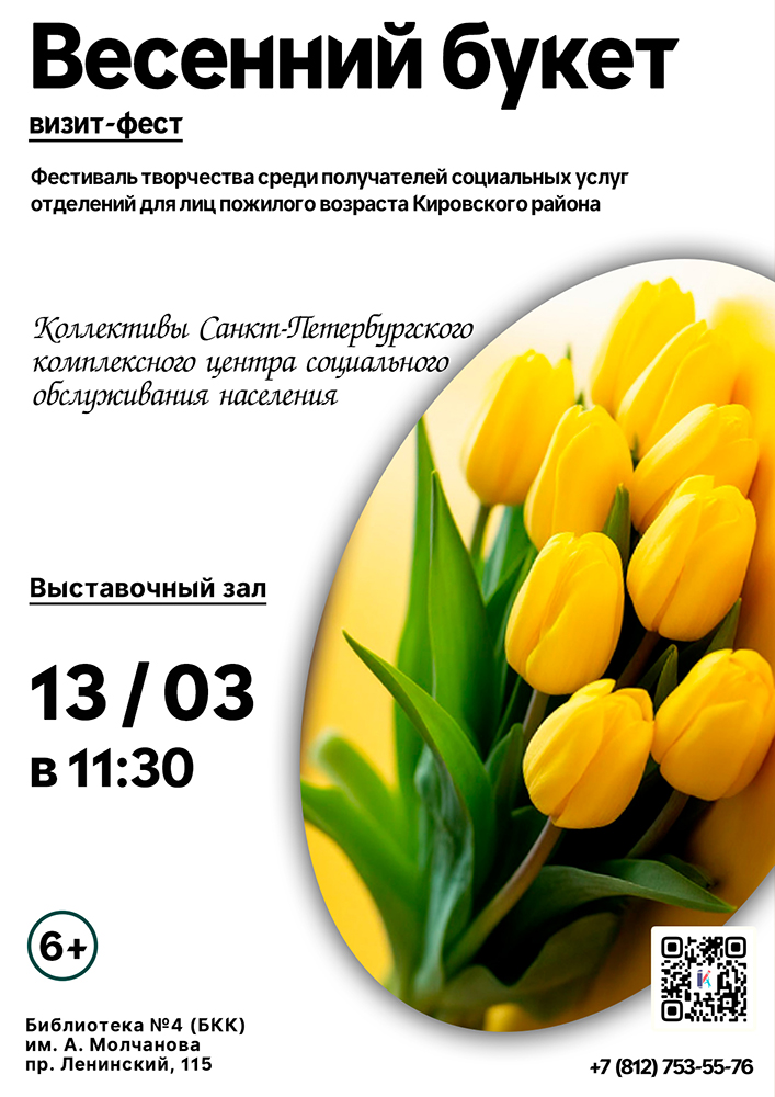 13 марта в 11.30 в Выставочном зале Библиотеки №4 (Библиотечно-культурного комплекса) им. А. В. Молчанова (Ленинский пр., д. 115) состоится Визит-фест "Весенний букет".