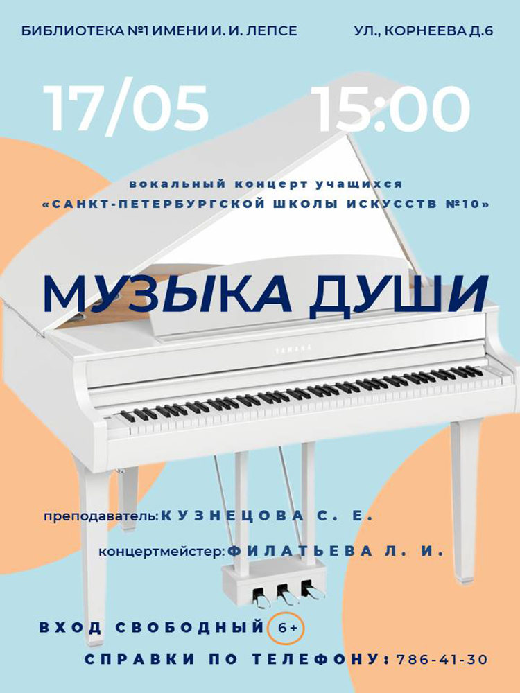 Библиотека №1 имени И. И. Лепсе (ул. Корнеева д. 6) приглашает на вокальный концерт учащихся Санкт-Петербургской школы искусств №10 "Музыка души". Преподаватель: Кузнецова С. Е.