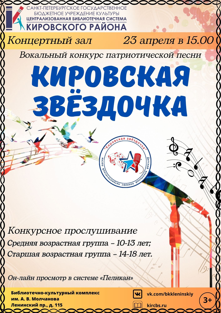 23 апреля в 15.00 в Концертном зале Библиотеки №4 (Библиотечно-культурного комплекса) им. А. В. Молчанова состоится конкурсное прослушивание средней и старшей возрастных групп (10-13 лет, 14-18 лет) вокального конкурса патриотической песни "Кировская звёздочка".