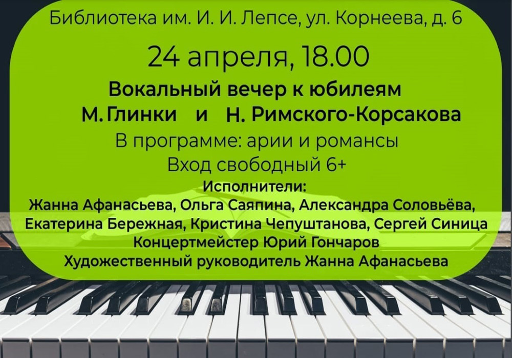 Библиотека №1 им. И. И. Лепсе приглашает на вокальный вечер к юбилеям М. И. Глинки и Н. А. Римского-Корсакова. В программе: арии и романсы.