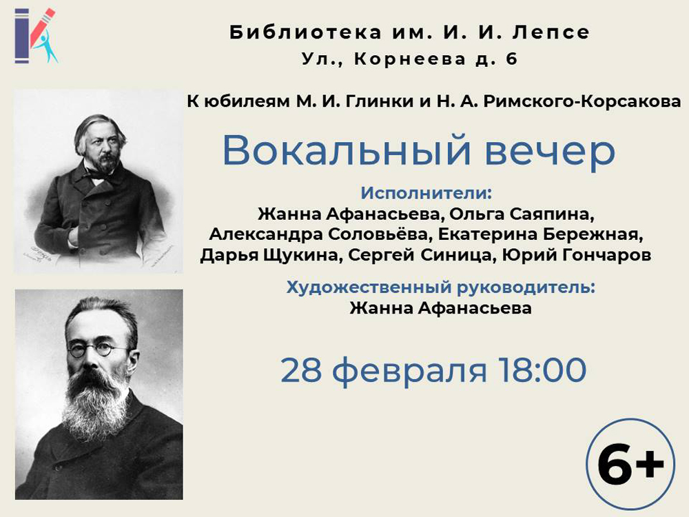 Библиотека №1 им. И. И. Лепсе приглашает на вокальный вечер к юбилеям М. И. Глинки и Н. А. Римского-Корсакова.