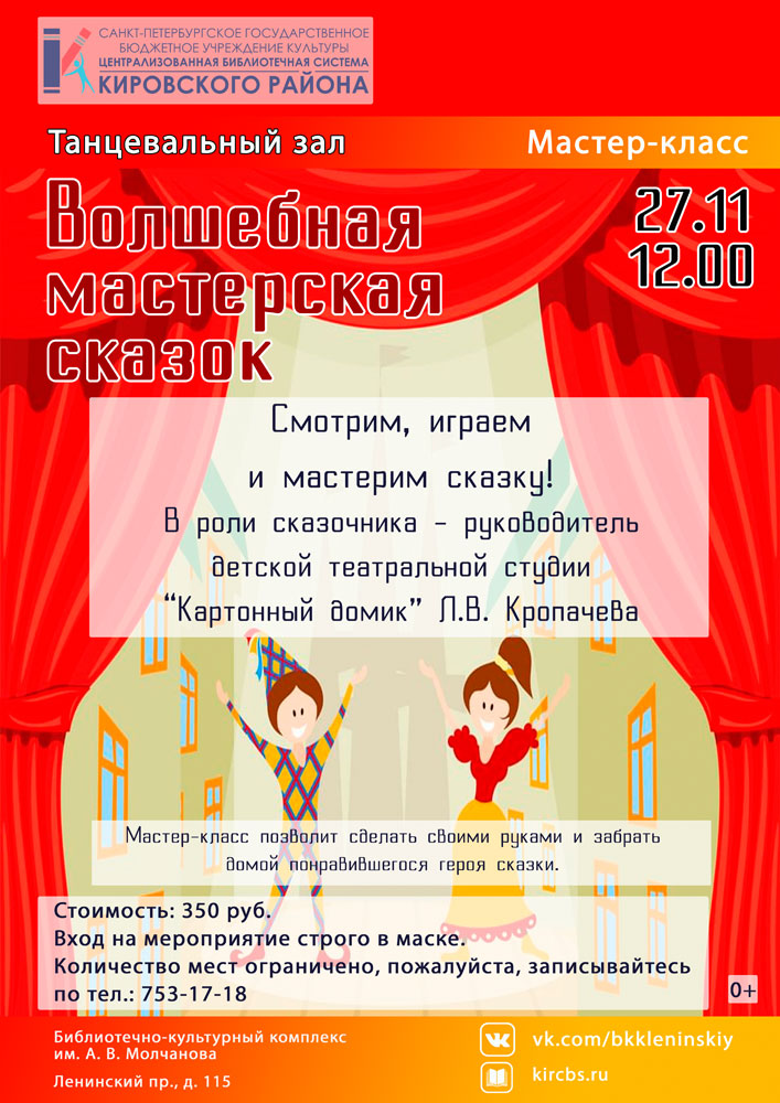 27 ноября в 12.00 в танцевальном зале Библиотечно-культурного комплекса им. А. В. Молчанова состоится Мастер-класс "Волшебная мастерская сказок".