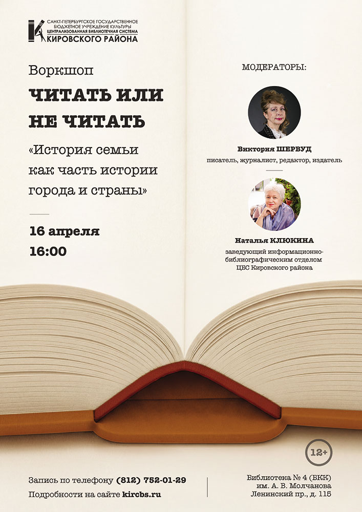 16 апреля в 16.00 в Библиотеке № 4 (Библиотечно-культурный комплекс) им. А. В. Молчанова (Ленинский пр., д. 115) состоится воркшоп "Читать или не читать" на тему "История семьи как часть истории города и страны". Ведущими-модераторами выступят журналист, сценарист, редактор, художник, член Союза журналистов России, Союза журналистов Санкт-Петербурга, Член Международного Союза литераторов и журналистов "Апиа" Виктория Шервуд (Пименова) и заведующая библиографическим отделом ЦБС Кировского района Наталья Клюкина.