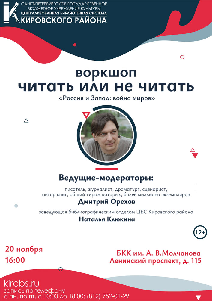 20 ноября в 16.00 в Библиотечно-культурном комплексе им. А. Молчанова (Ленинский пр., д. 115) состоится воркшоп "Читать или не читать" на тему "Россия и Запад: война миров". Ведущими-модераторами выступят: писатель, журналист, драматург, сценарист, автор книг, общий тираж которых более миллиона экземпляров, Дмитрий Орехов и заведующая библиографическим отделом ЦБС Кировского района Наталья Клюкина.