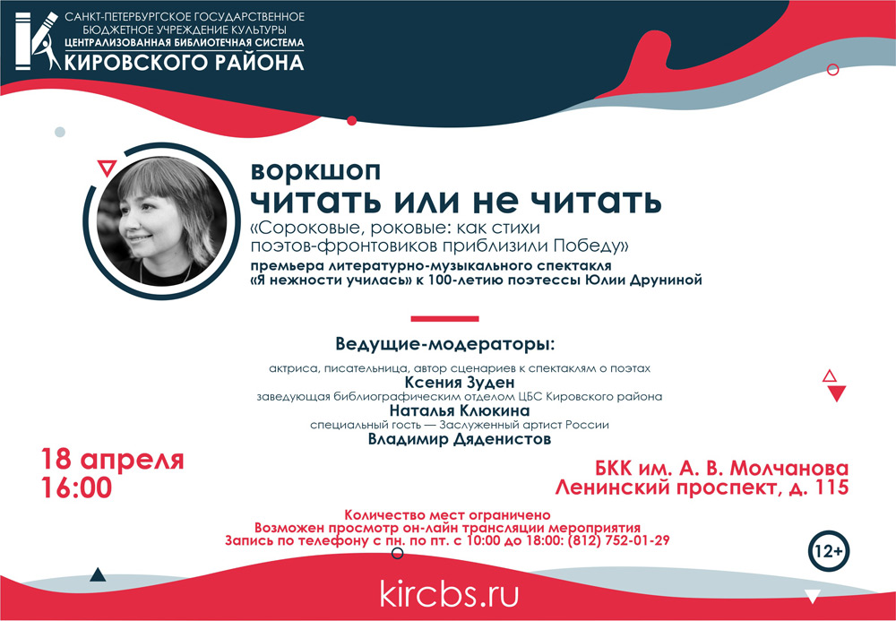В четверг, 18 апреля, в 16.00 в Библиотечно-культурном комплексе им. А. В. Молчанова, на Ленинском пр., 115, состоится воркшоп "Читать или не читать" на тему "Сороковые, роковые: как стихи поэтов-фронтовиков приблизили Победу".