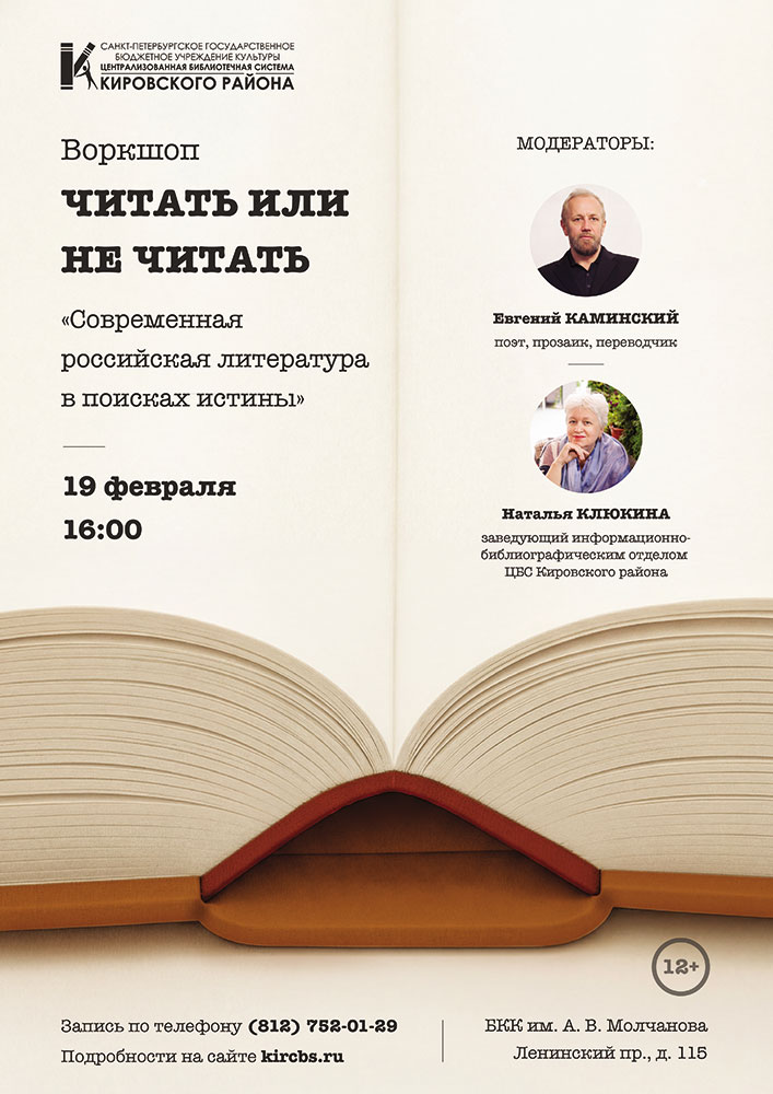 19 февраля в 16.00 в Библиотечно-культурном комплексе им. А. В. Молчанова (Ленинский пр., д. 115) состоится воркшоп "Читать или не читать" на тему "Современная российская литература в поисках истины". Ведущими-модераторами выступят русский поэт, прозаик, переводчик, автор десяти поэтических сборников, девяти романов, многочисленных журнальных публикаций - Евгений Юрьевич Каминский и заведующая библиографическим отделом ЦБС Кировского района Наталья Клюкина.