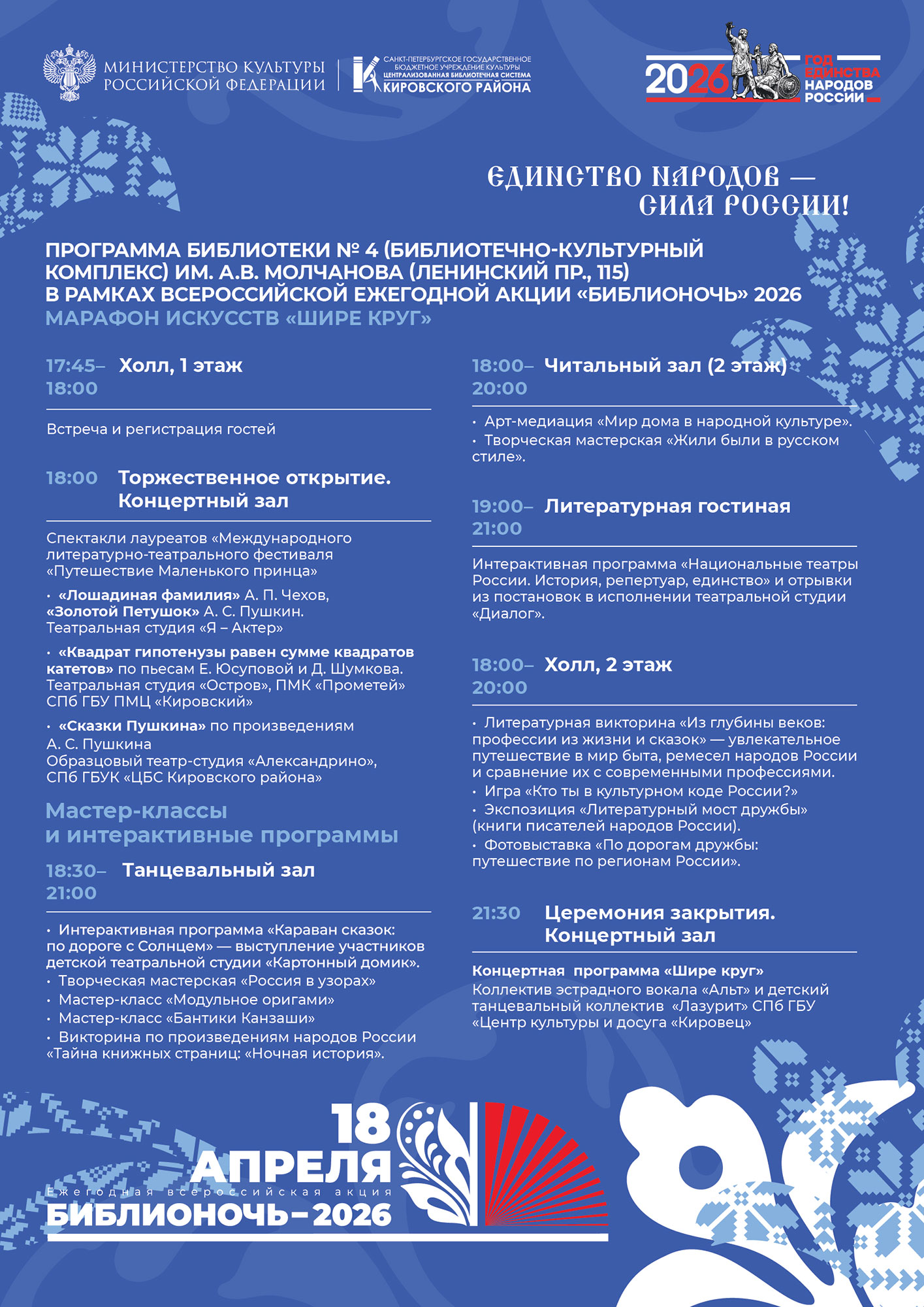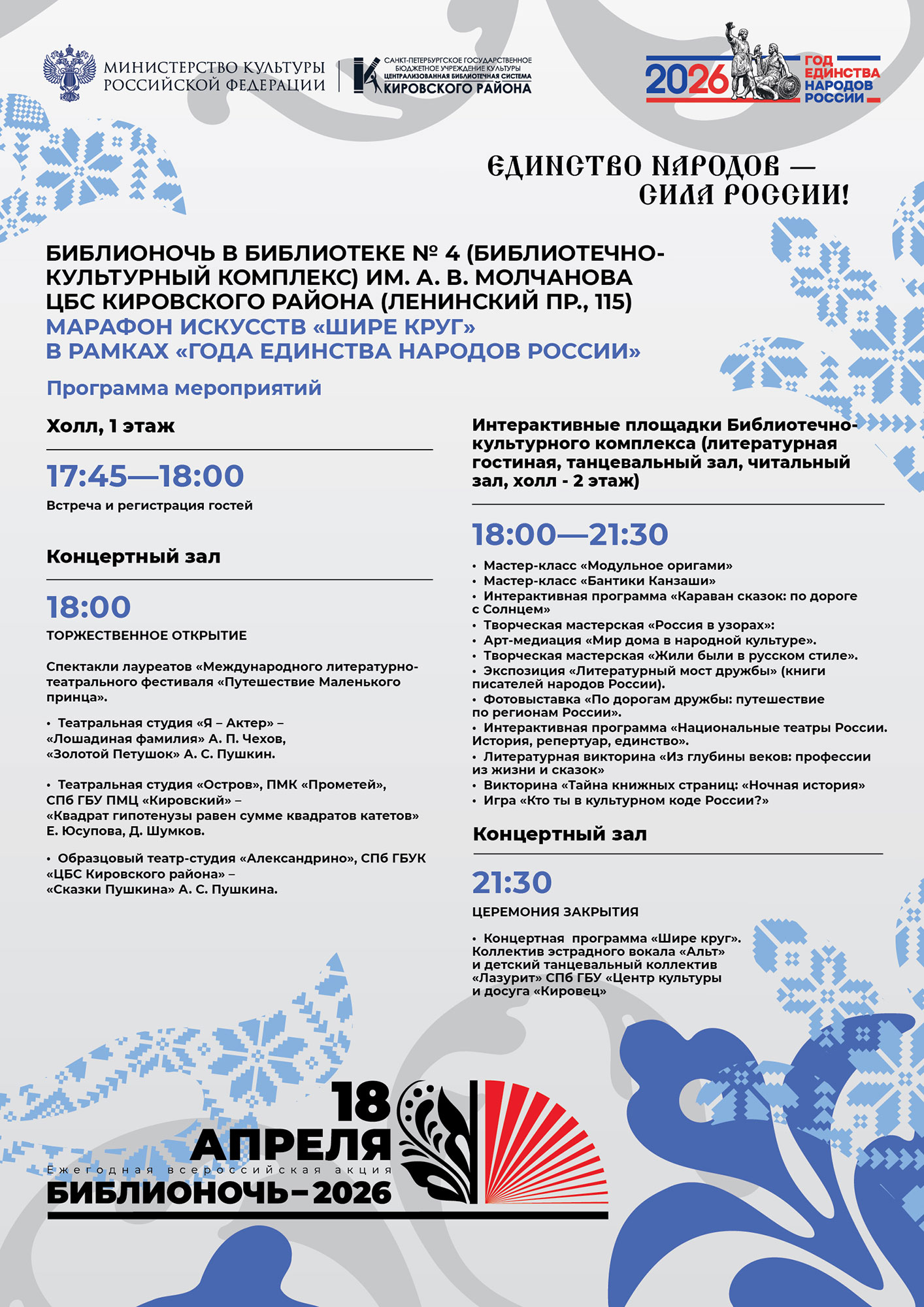 18 апреля в 18.00 Централизованная библиотечная система Кировского района присоединится к юбилейной, 15-й Всероссийской акции "Библионочь 2026". В этом году акция посвящена Году единства народов России и проходит под лозунгом: "Единство народов - сила России". Основными площадками масштабного события станут Библиотека № 4 (Библиотечно-культурный комплекс имени) А. В. Молчанова (Ленинский пр., д. 115) и Центральная детская библиотека имени В. В. Голявкина (пр. Ветеранов, д. 76).