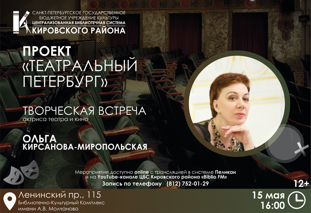 15 мая 2023 года в театрально-концертном зале Библиотечно-культурного комплекса им. А. В. Молчанова (Ленинский пр., 115) в рамках проекта "Театральный Петербург" состоится творческая встреча с Ольгой Германовной Кирсановой-Миропольской, актрисой театра и кино.