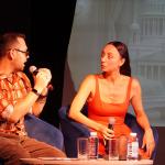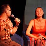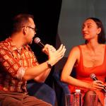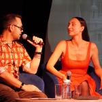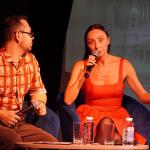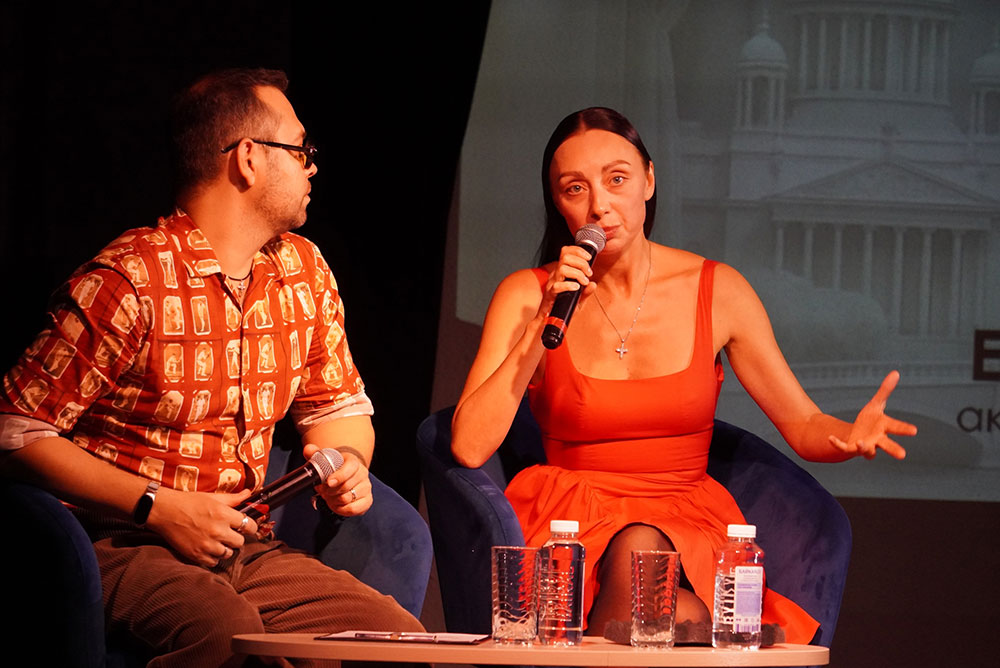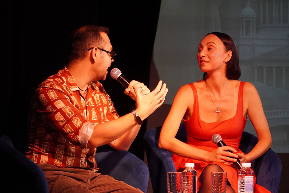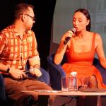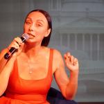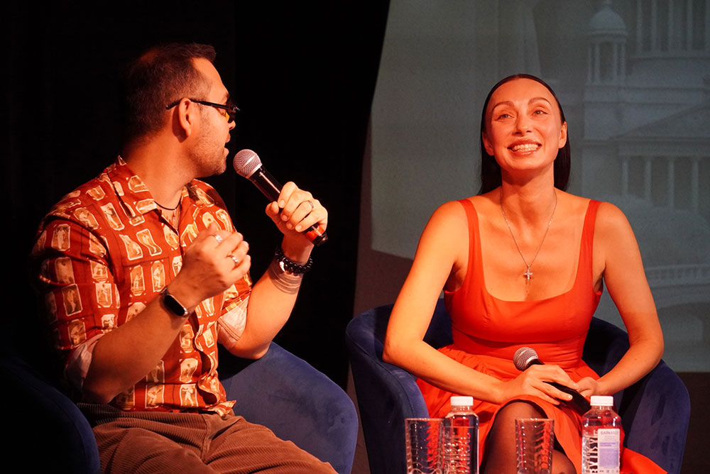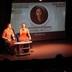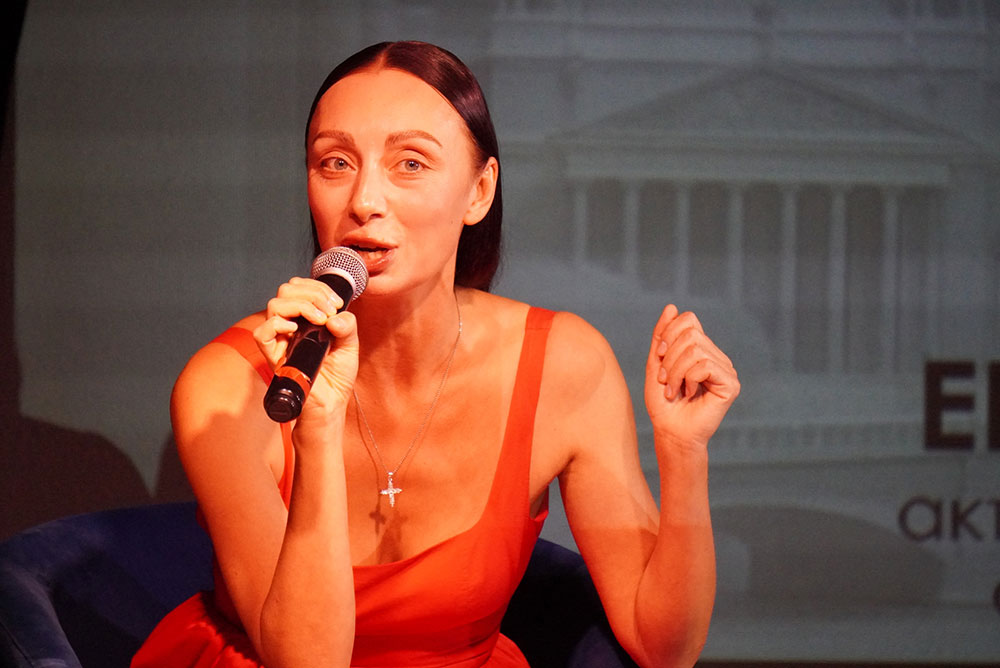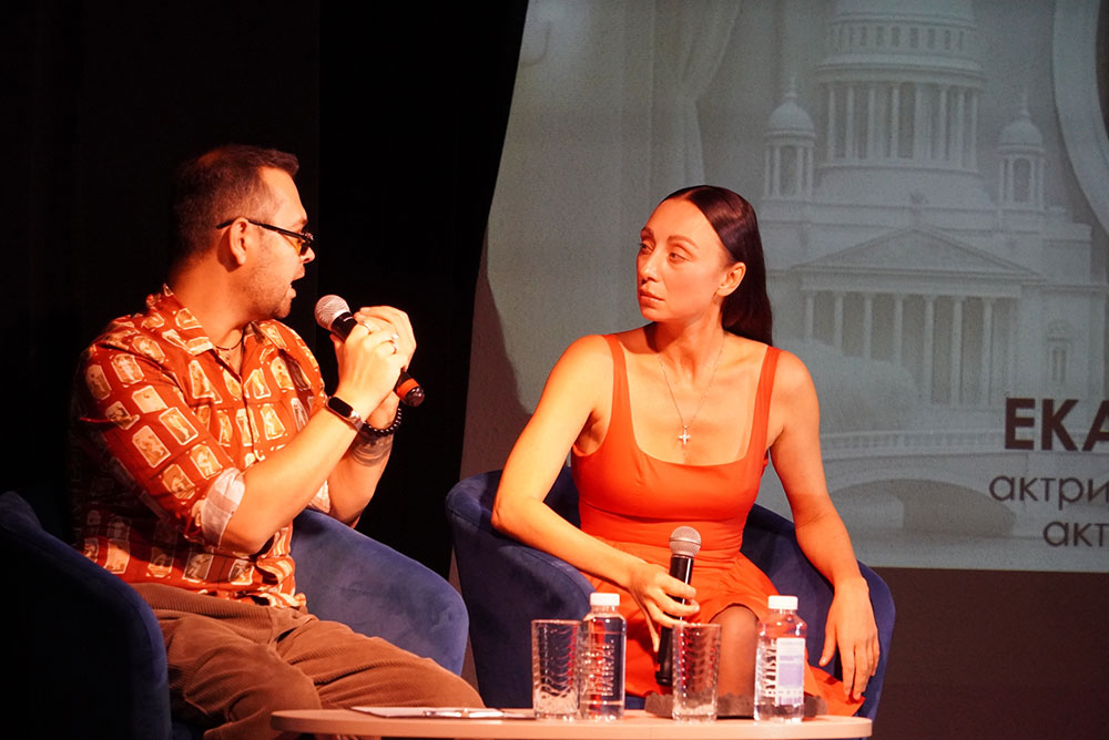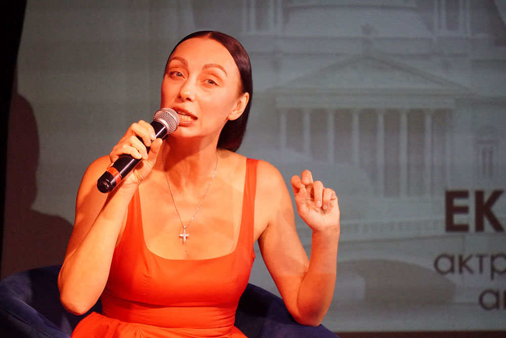 Модератор встречи Илья Мясников задавал вопросы о творческом пути актрисы, её театральных работах, кинематографическом опыте, успехах в качестве хореографа-постановщика спектаклей и модели подводных съёмок.
