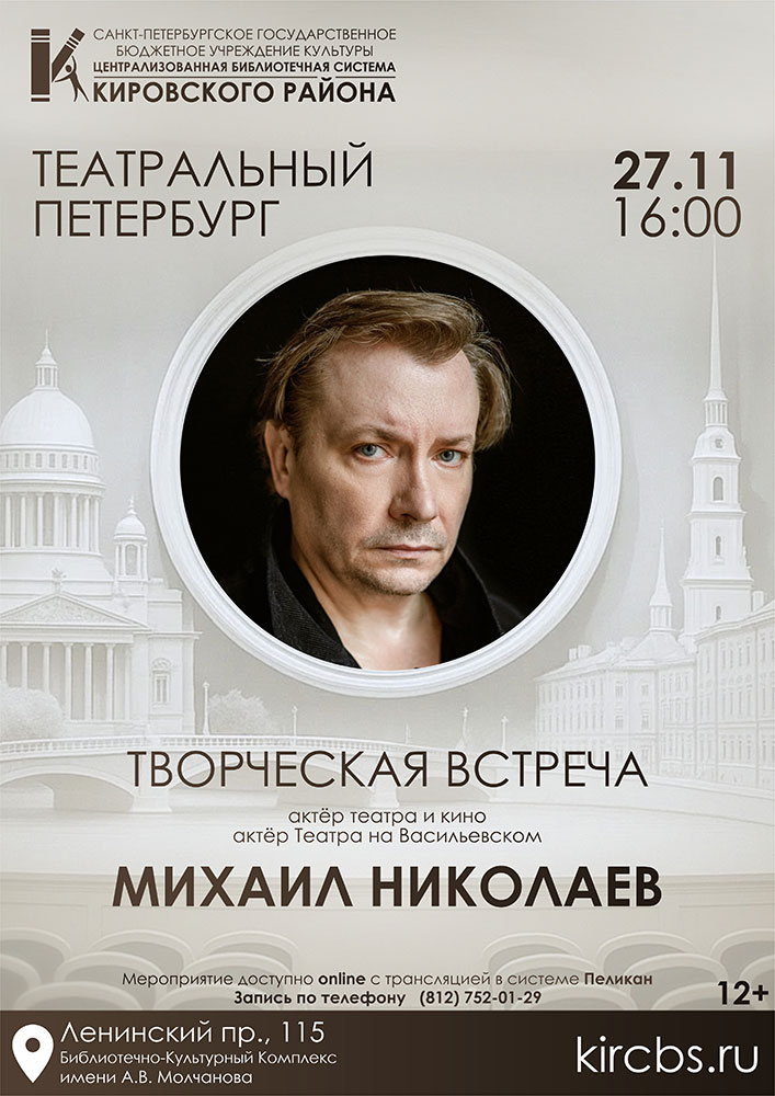 27 ноября 2025 года в 16.00 в театрально-концертном зале Библиотечно-культурного комплекса им. А. Молчанова (Ленинский пр., д. 115) в рамках проекта "Театральный Петербург" состоится творческая встреча с артистом театра и кино, артистом Театра на Васильевском Михаилом Михайловичем Николаевым.