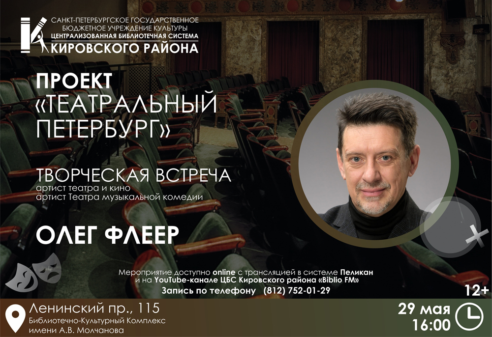 29 мая 2023 года в 16.00 в Библиотечно-культурном комплексе им. А. В. Молчанова в рамках проекта "Театральный Петербург" состоится Творческая встреча с Олегом Геннадьевичем Флеером, актером театра и кино, артистом Театра музыкальной комедии.