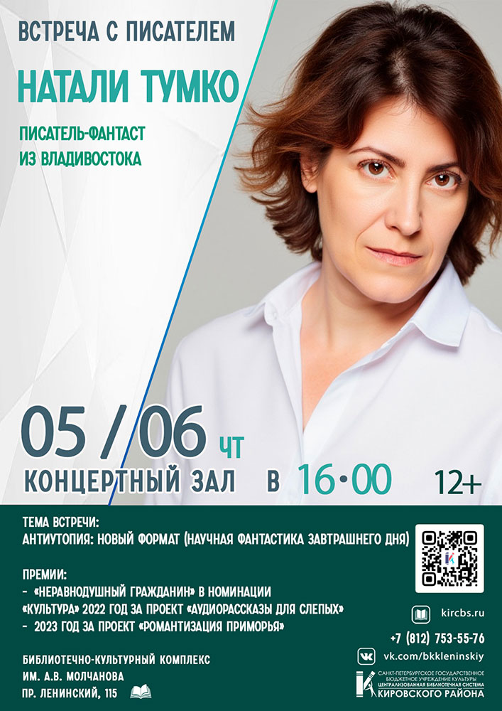 Дорогие друзья! Приглашаем вас на встречу с известной писательницей-фантастом, футурологом и заместителем председателя Союза российских писателей по Приморскому краю - Натали Тумко. Она известна своими работами в жанре научной фантастики и футурологии, завоевав признание критиков и почитателей жанра. Премии "Неравнодушный гражданин" в Номинации "Культура" в 2022 году за проект "Аудиорассказы для слепых" и в 2023 году за проект "Романтизация Приморья".