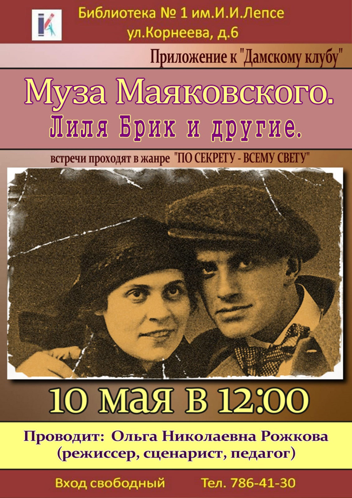 Библиотека №1 им. И. И. Лепсе приглашает на встречу в жанре "По секрету - всему свету": "Муза Маяковского. Лиля Брик и другие".