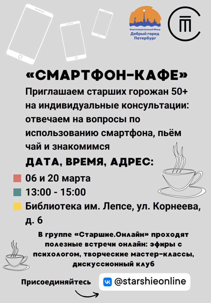 Библиотека №1 им. И. И. Лепсе приглашает старших горожан (50+) на индивидуальные консультации: отвечаем на вопросы по использованию смартфона, пьем чай и знакомимся.