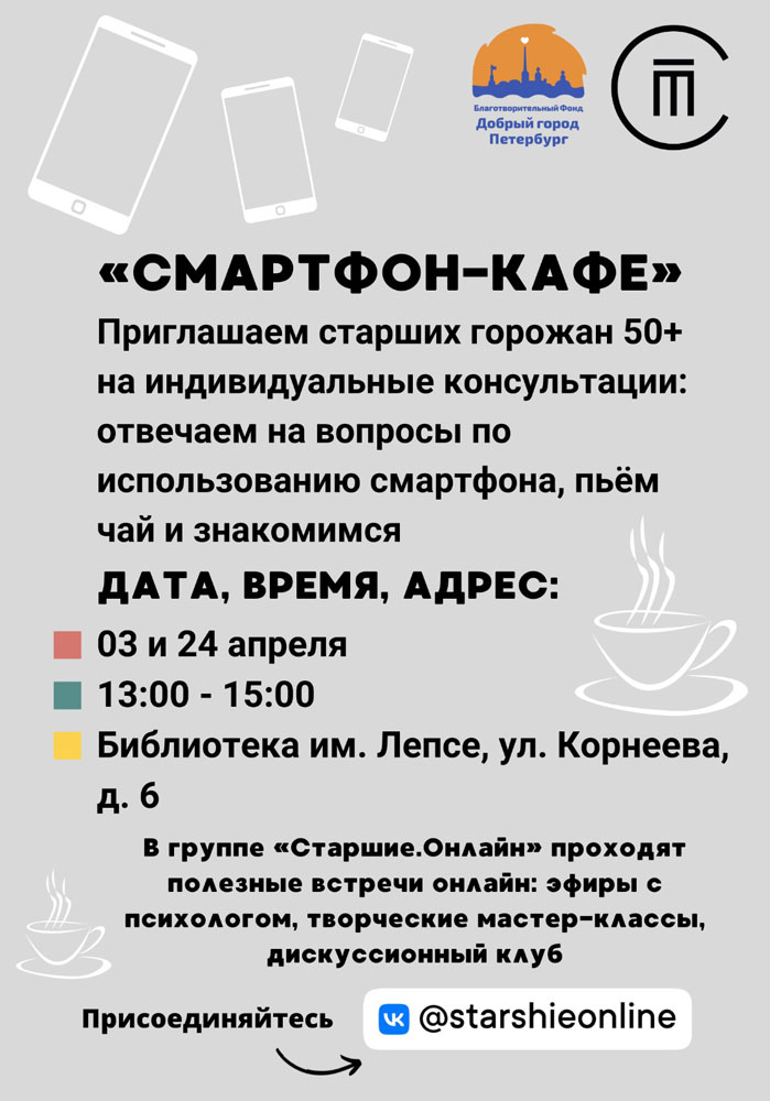 Библиотека №1 им. И. И. Лепсе приглашает старших горожан (50+) на индивидуальные консультации: отвечаем на вопросы по использованию смартфона, пьем чай и знакомимся.