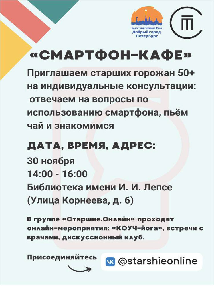 Библиотека №1 приглашает старших горожан (50+) на индивидуальные консультации: отвечаем на вопросы по использованию смартфона, пьем чай и знакомимся.