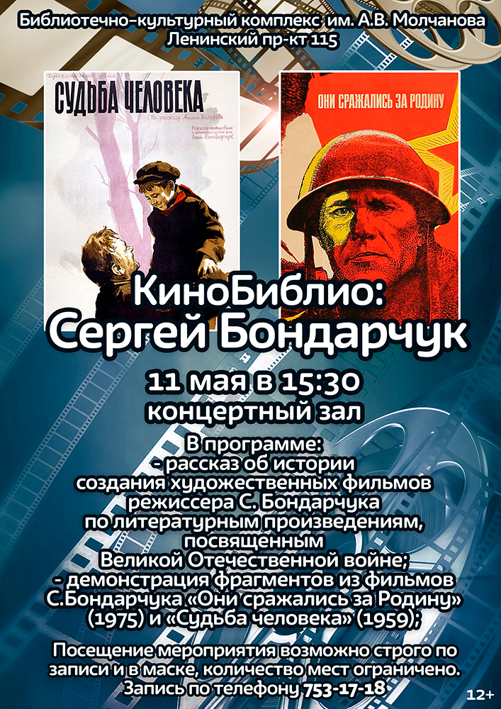 11 мая в 15.30 в концертном зале Библиотеки №4 (Библиотечно-культурный комплекс) имени А. В. Молчанова, в рамках мероприятий посвященных 76-й годовщине Победы советского народа в Великой Отечественной войне 1941-1945 годов, состоится Встреча в киногостиной "КиноБиблио: Сергей Бондарчук".