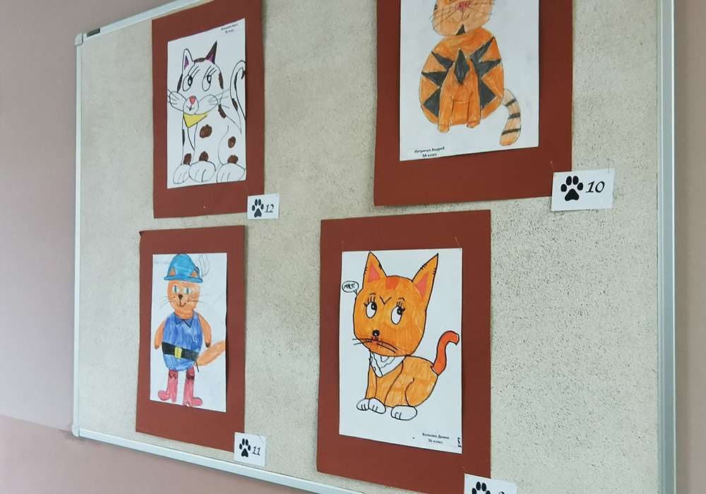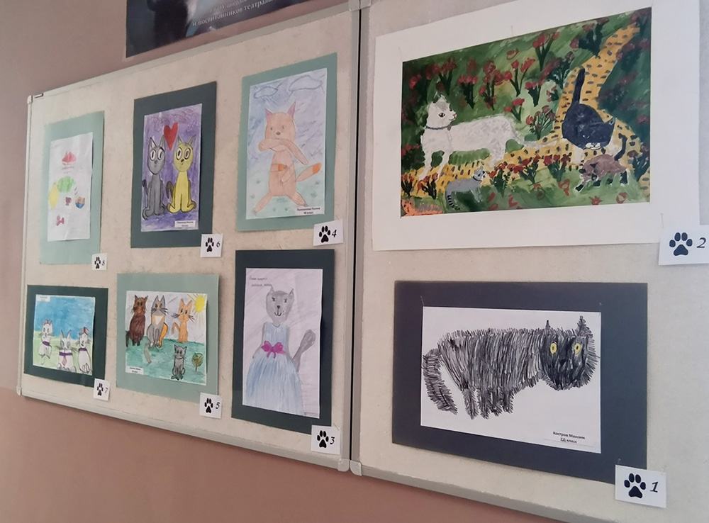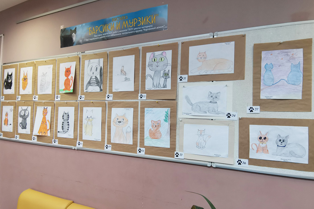 На выставке были представлены работы учащихся ГБОУ школы-интерната для слабовидящих детей Кировского район и работы воспитанников театрального кружка "Картонный домик", посвященных Дню кошек в России.