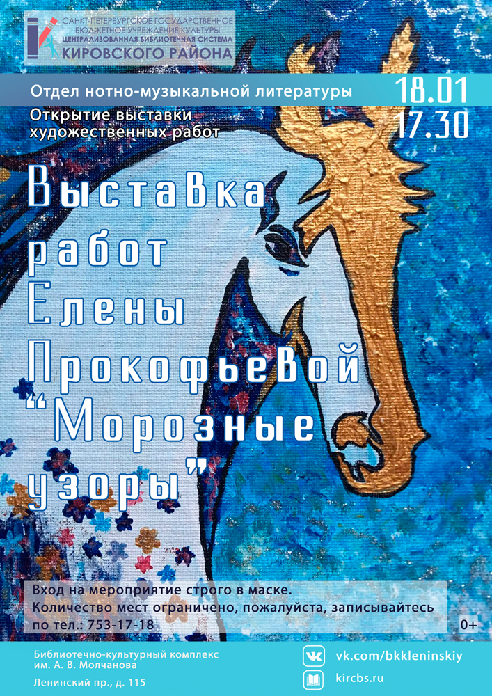 18 января в 17.30 в отделе нотно-музыкальной литературы Библиотечно-культурного комплекса им. А. В. Молчанова состоится открытие Выставки художественных работ Елены Прокофьевой "Морозные узоры".