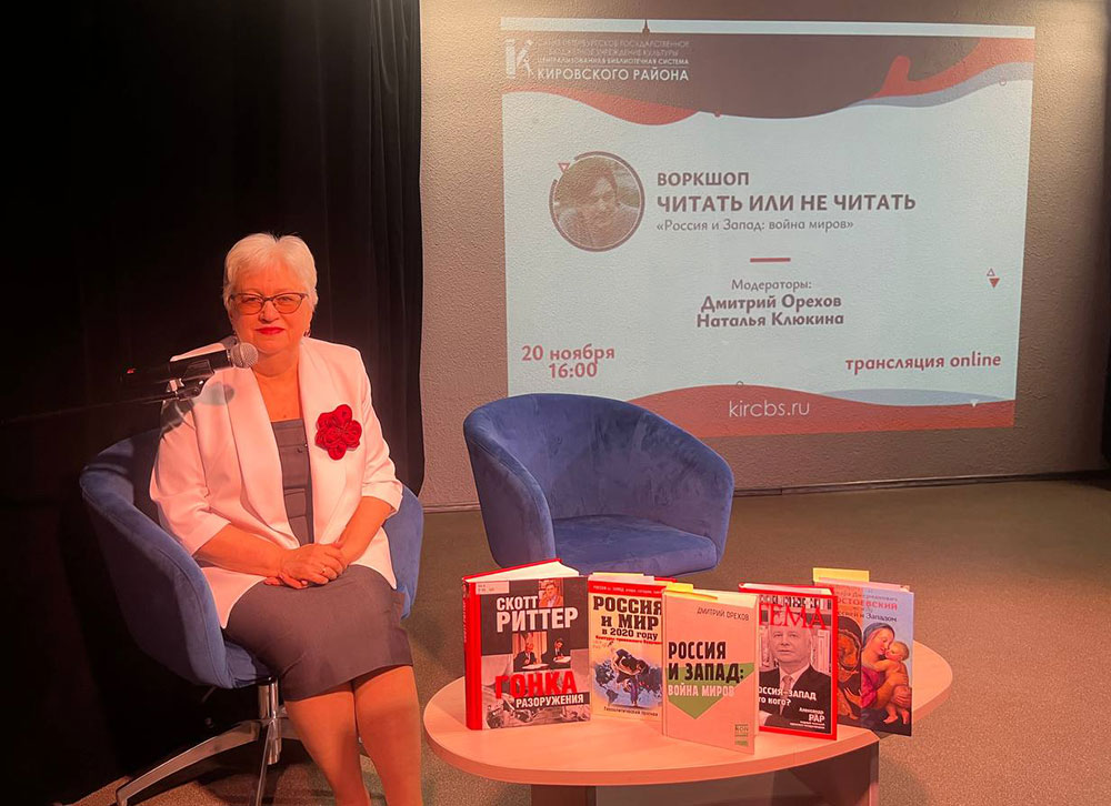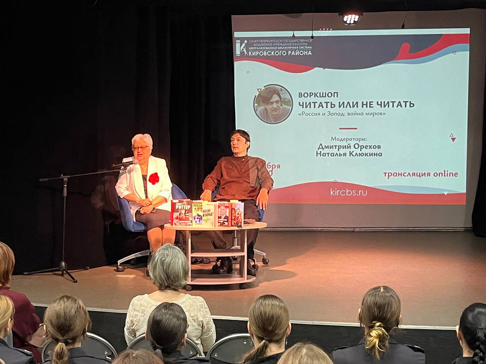 20 ноября в 16.00 в Библиотечно-культурном комплексе им. А. Молчанова (Ленинский пр., 115) состоялся воркшоп "Читать или не читать" на тему "Россия и Запад: война миров". Модераторами выступили: писатель, журналист, драматург, сценарист, автор книг, общий тираж которых более миллиона экземпляров, Дмитрий Орехов и заведующая библиографическим отделом ЦБС Кировского района Наталья Клюкина.