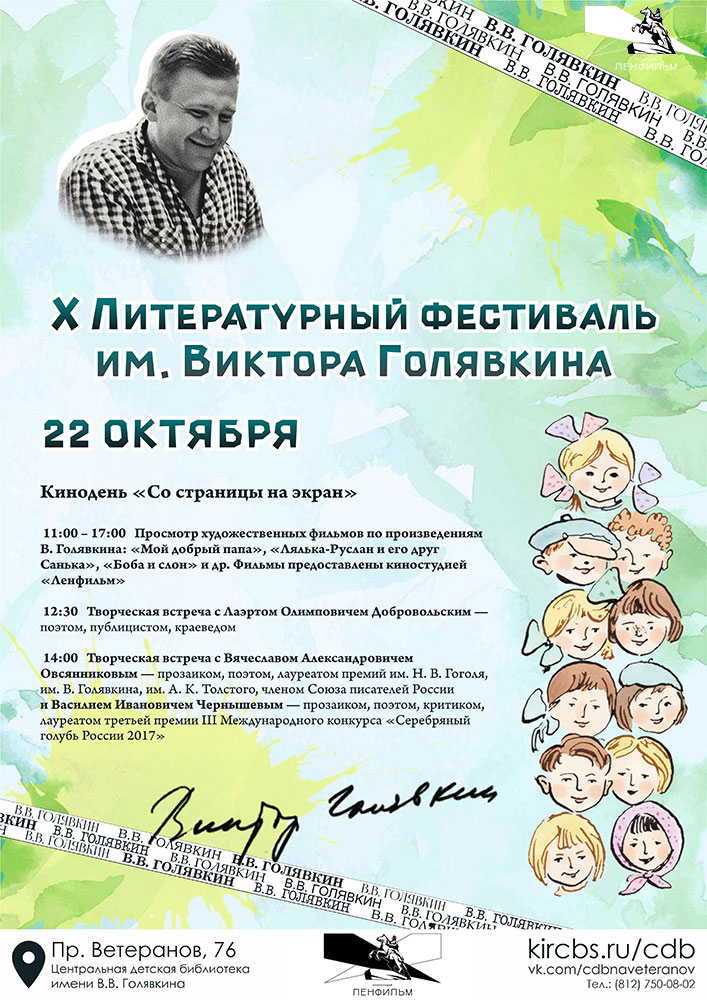 22 октября в 11.00 в Центральной детской библиотеке им. В. В. Голявкина (пр. Ветеранов, д. 76) состоится Кинодень "Со страницы на экран", в рамках X Литературного фестиваля им. В. В. Голявкина.