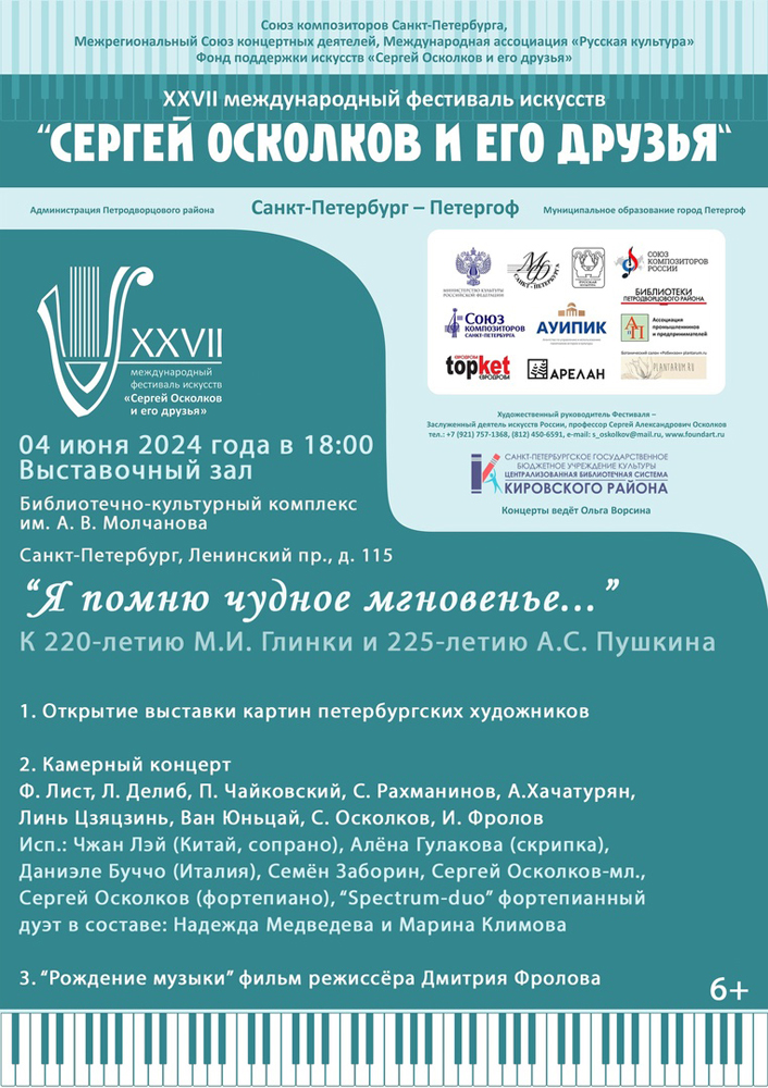 4 июня в 18.00 в Выставочном зале Библиотечно-культурного комплекса им. А. В. Молчанова (Ленинский пр., д. 115) состоится XXVII международный фестиваль искусств "Сергей Осколков и его друзья" - "Я помню чудное мгновенье…" к 220-летию М. И. Глинки и 225-летию А. С. Пушкина.