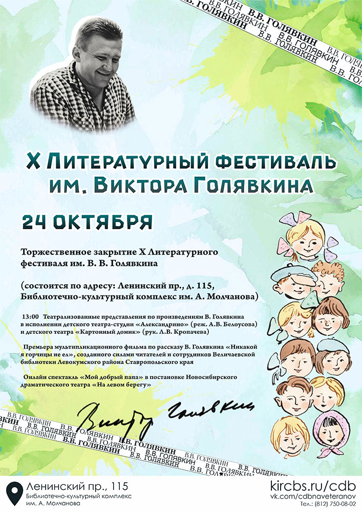 24 октября в 13.00 на сцене Библиотечно-культурного комплекса им. А. В. Молчанова (Ленинский пр., д. 115) состоится Закрытие X Литературного фестиваля им. В. В. Голявкина.